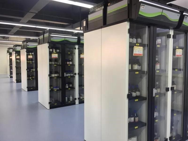 孙晓丽:这一套系统在我们三楼的前处理战略合作实验室内可以看到,我们考虑到人员安全健康,操作习惯,及后期运维等问题,通过这套系统实现了在一个普通的房间演变成基础前处理实验室!不同尺寸的无管道净气型通风柜可以解决前处理基础实验及常规前处理仪器的挥发问题,实验室内的净气型储药柜解决了就近存取使用的问题和试剂本身的挥发问题!